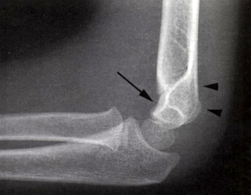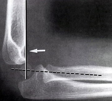 En linie langs forsiden af humerus går normalt igennem midterste 1/3 del af capitulum humeri, hvis capitulum ligger bagved skal der reponeres og osteosynteres i GA. Hos børn under 4 år tillades lidt større dislokation.