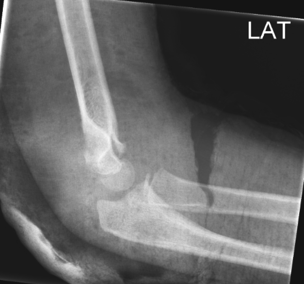 Bemærk dislocation af radius. Skal reponeres i GA.