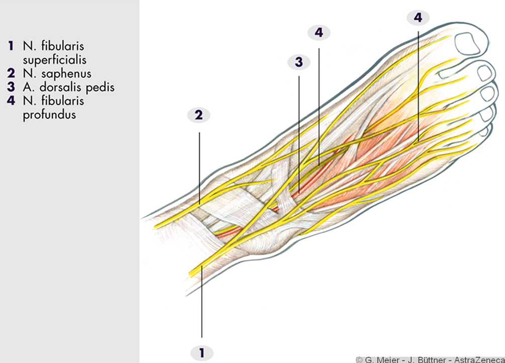 patienten bedes ekstendere foden og storetåen mod modstand hvorved senerne identificeres lige over ankelleds niveau. Perpendikulært indstik mellem senerne og lige lateralt for a.dorsalis pedis (a. tibialis ant.), penetrerende extensorretinaklet til knoglekontakt. (Visse steder anbefales det dog at deponere på begge sider af arterien.) Ved anvendelse af nervestimulator opsøges maksimale stimulationssynkrone paræstesier i relevant cutant område (Obs sensoriske nerver har længere chronaxi hvorfor impulsvarigheden øges til 0,3 ms.). 4-6 ml LA injiceres. Man kan kan vælge at opsøge n. peroneus (fibularis) superficialis og dennes endegrene på dette niveau ved at retrahere nålen subcutant , og redirigere den mod laterale maleol, deponerende 4 - 6 ml LA.