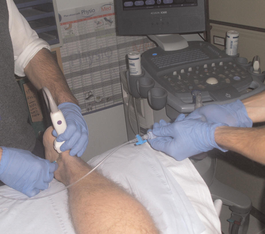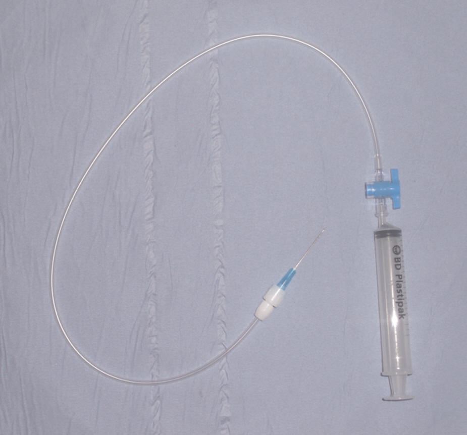 Start med 9 ml lidocain blandet med en ml steroid. Derefter 40 ml isotonisk