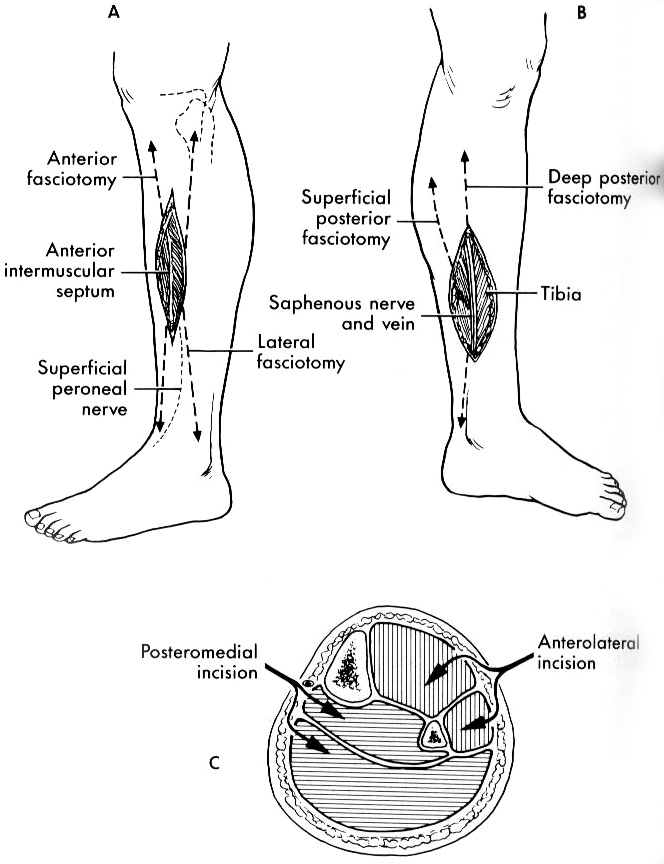 Skal altid behandles med akut faciotomi. (Se herunder, 4 kompartment)