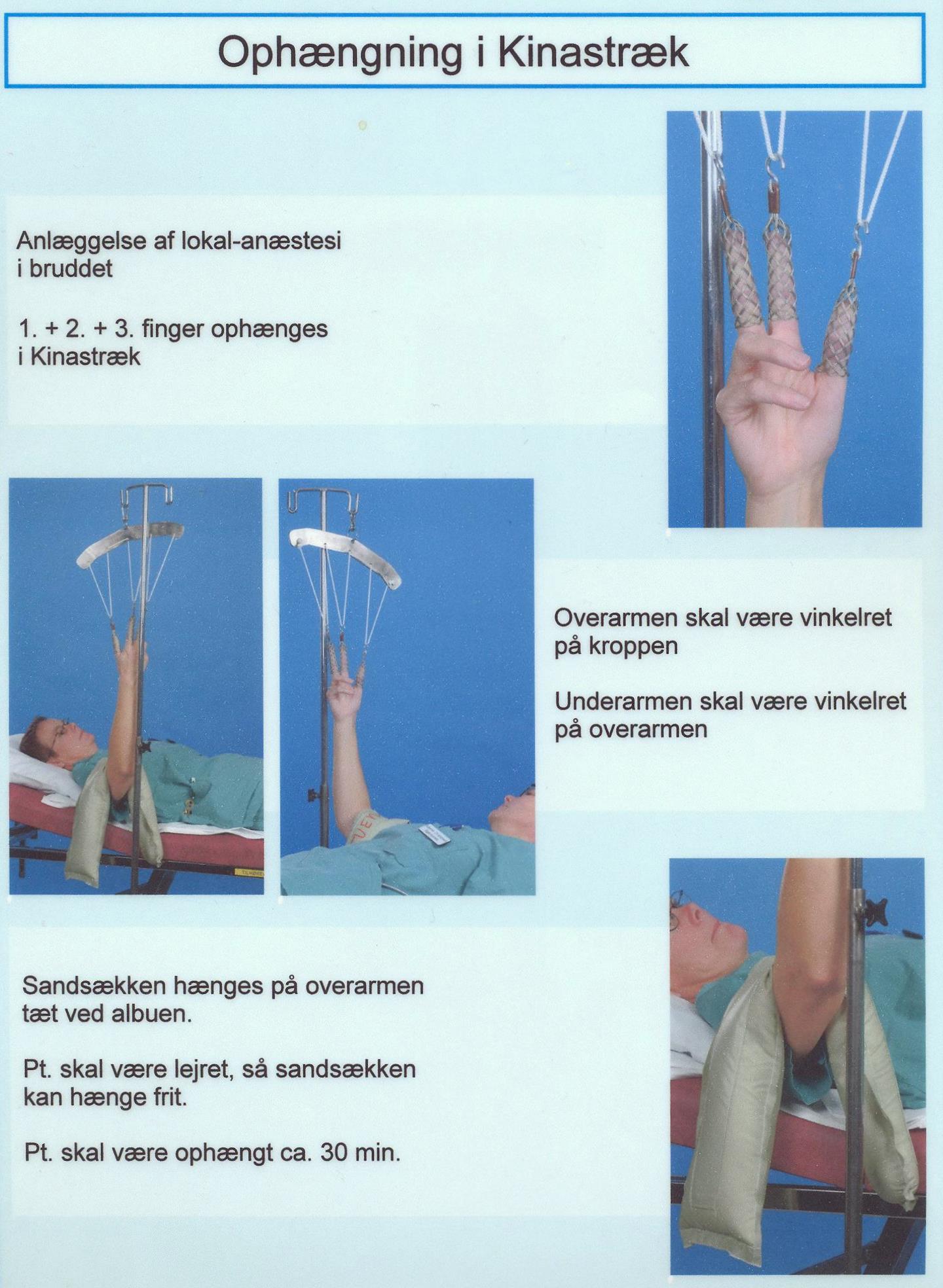 Start med at installere en lokal bedøvelse med 10 ml xylocain eller Marcain i brudlinien, dorsal/radial adgang (der kan trækkes blod tilbage). Ved afsprængning af proc styloideus ulna lægges få ml lokalbedøvelse ulnart.