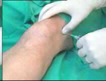 Punkt 3:        Indstikket gøres anterolateralt i bursa suprapatellaris.